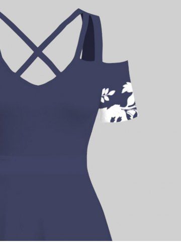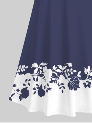 Maxi Robe Ligne A Bicolore Croisée Branche Fleurie Imprimée à Epaule Dénudée de Grande Taille - Bleu De Minuit - 4x