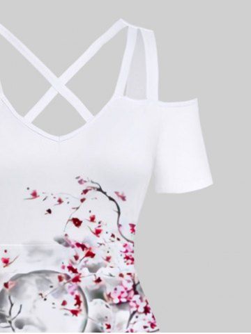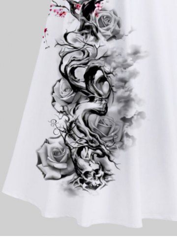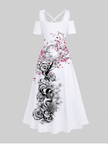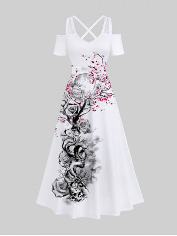 Maxi Robe Ligne A Croisée Branche D'Arbre Rose Fleur Imprimées à Epaule Dénudée de Grande Taille - Blanc - Blanc