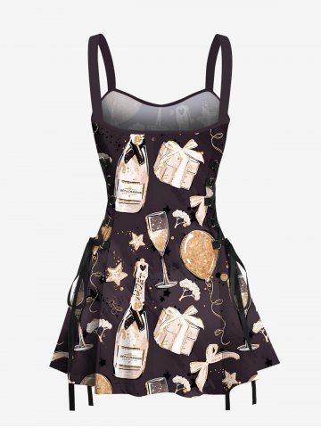 Party New Years Eve Gift Balloon Bowknot Wine Print Lace Up A Line Dress - Noir - Noir