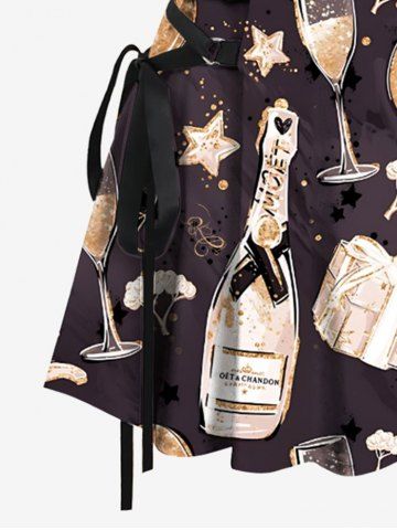Party New Years Eve Gift Balloon Bowknot Wine Print Lace Up A Line Dress - Noir - Noir