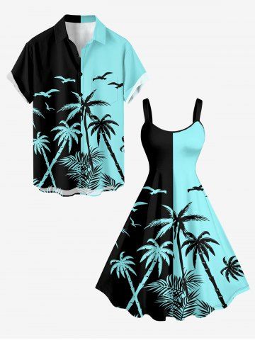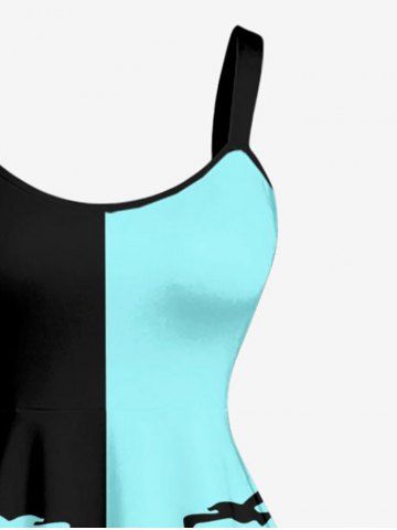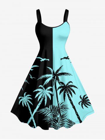 Plus Size Coconut Tree Bird Colorblock Print Hawaii Tank Dress - Turquoise - Turquoise