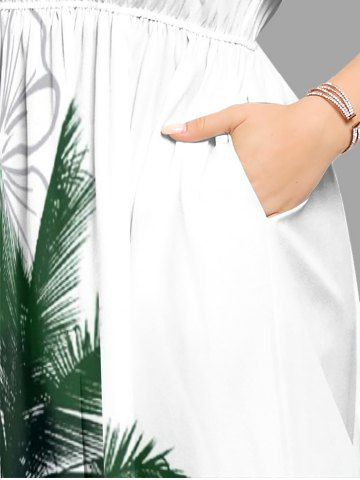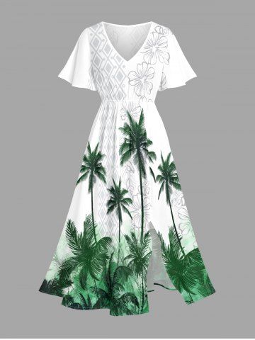 Plus Size Coconut Tree Flower Geometric Graphic Print Hawaii Split Pocket A Line Midi Dress - Vert - Vert
