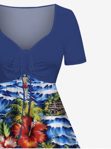 Plus Size Coconut Tree Hibiscus Flower Sea Waves Tropical Print Cinched Hawaii Dress - Bleu - Bleu