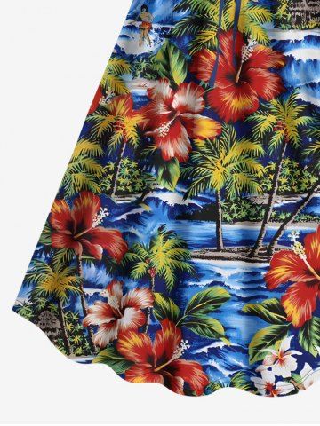 Robes Graphiques > Plus Size Coconut Tree Hibiscus Flower Sea Waves Tropical Print Cinched Hawaii Dress