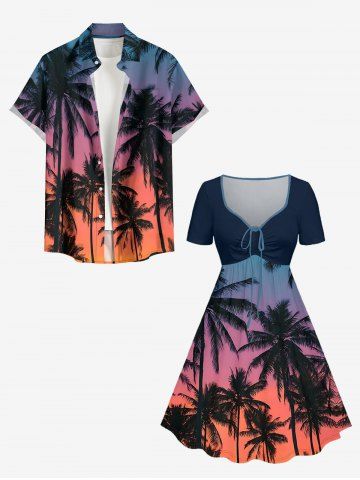 Plus Size Coconut Tree Ombre Sky Print Hawaii Cinched A Line Dress - Bleu Profond - 2x