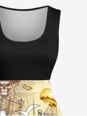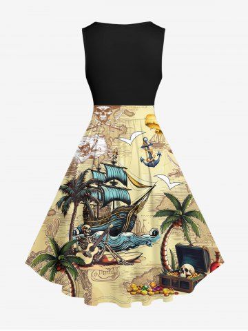 Plus Size Coconut Tree Sailboat Skull Pirate Print Hawaii Cruise Vintage Swing A Line Dress - Jaune Clair - 1x