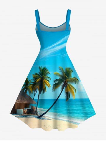 Plus Size Coconut Tree Sea Beach Print Hawaii A Line Dress - Bleu Ciel - Bleu Ciel