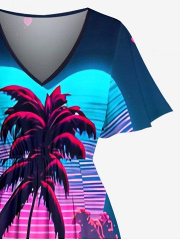 Plus Size Coconut Tree Sea Ombre Heart Print Hawaii Split Pocket A Line Midi Dress - Bleu Profond - 1x
