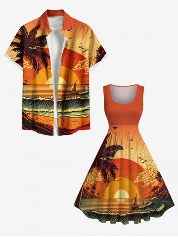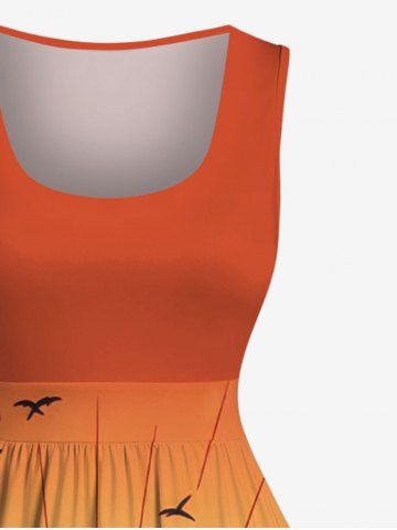 Plus Size Coconut Tree Sea Waves Sunset Print 1950s Hawaii Vintage Dress - Orange - Orange