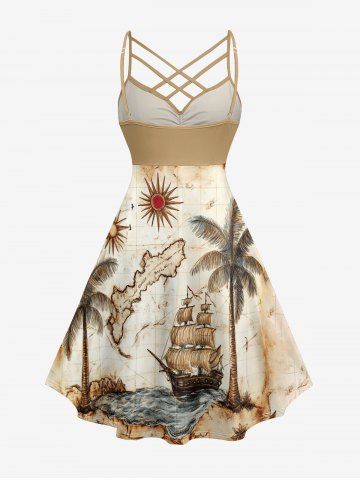 Robes Graphiques > Plus Size Coconut Tree Sun Map Ship Cruise Print Ruched Lattice Crisscross Straps Hawaii Dress