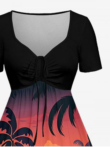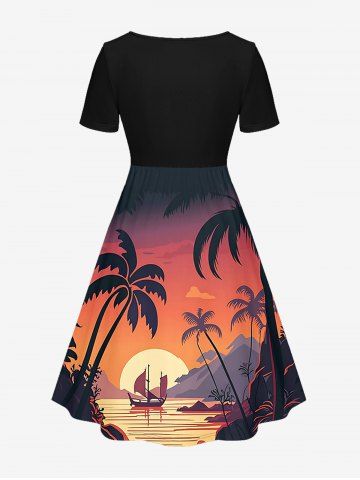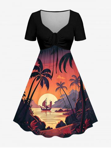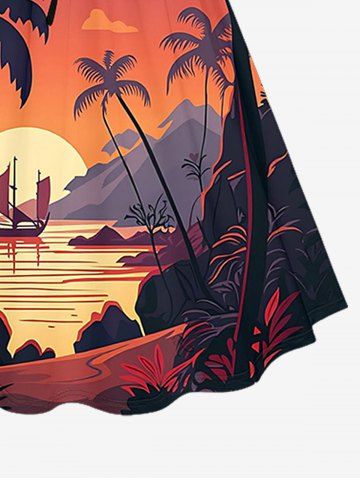 Robes Graphiques > Plus Size Coconut Tree Sun Mountain Seascape Boat Print Cinched Hawaii Dress