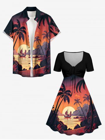 Plus Size Coconut Tree Sun Mountain Seascape Boat Print Cinched Hawaii Dress - Orange Vif - 2x