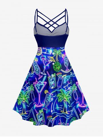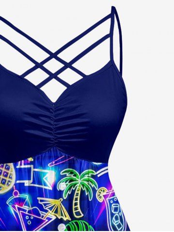 Plus Size Coconut Tree Tropical Leaf Fruit Juice Print Ruched Lattice Crisscross Straps Hawaii Dress - Bleu - Bleu