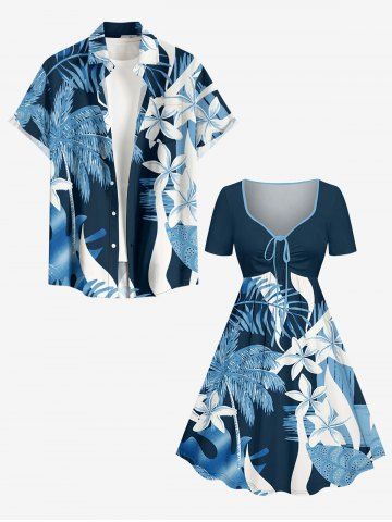 Plus Size Coconut Tree Tropical Leaf Sea Flower Print Hawaii Cinched A Line Dress - Cadetblue - 1x