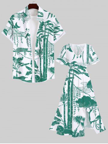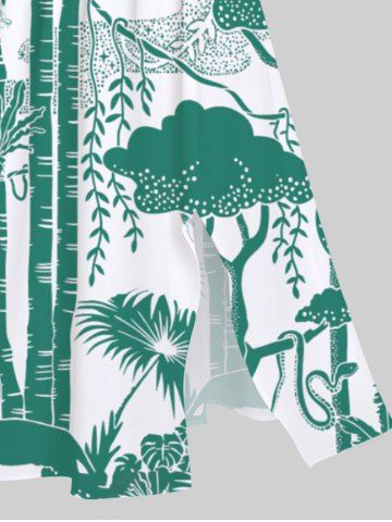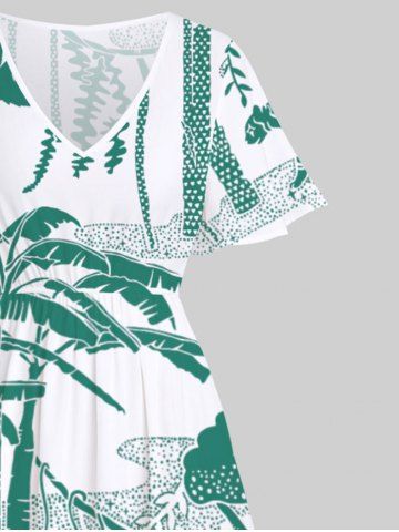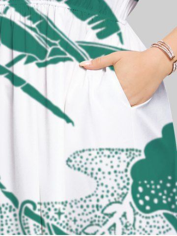 Plus Size Coconut Tree Tropical Leaves Cat Moon Print Hawaii Split Pocket A Line Midi Dress - Blanc - Blanc