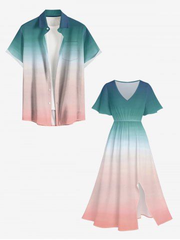 Plus Size Dip Dye Ombre Print Hawaii Split Pocket A Line Midi Dress - Turquoise Foncée - M