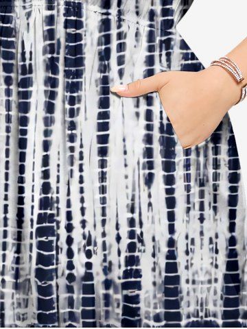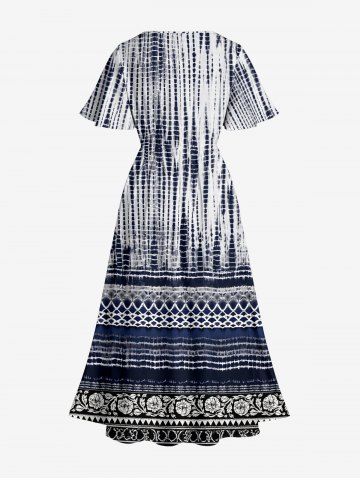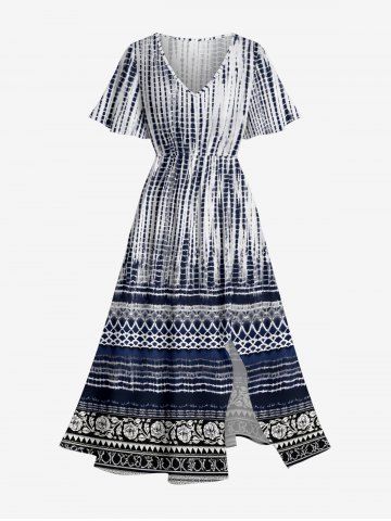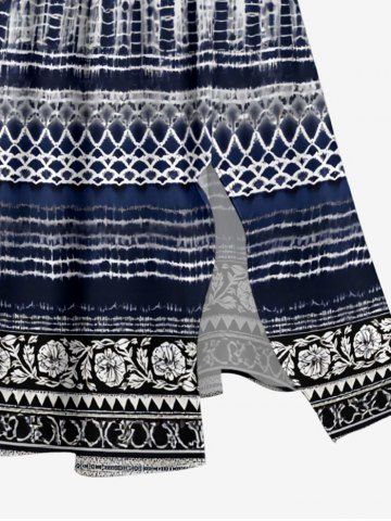 Plus Size Ethnic Floral Pattern Tribal Print Split Hawaii Midi Dress - Bleu Profond - M