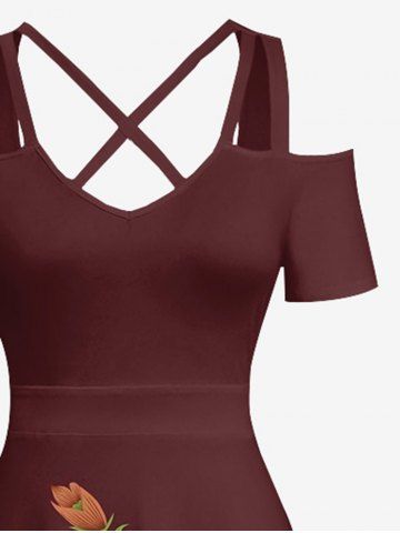 Robes Graphiques > Plus Size Flower Leaf Branch Print Hawaii Cold Shoulder Crisscross A Line Maxi Dress