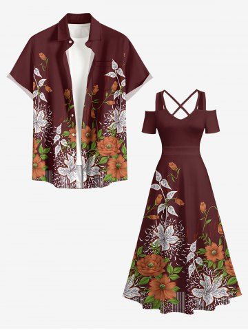 Robes Graphiques > Plus Size Flower Leaf Branch Print Hawaii Cold Shoulder Crisscross A Line Maxi Dress