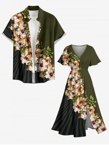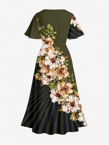 Plus Size Flower Leaf Branch Print Hawaii Split Pocket A Line Midi Dress - Vert Armée - 4x