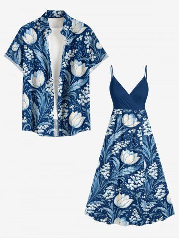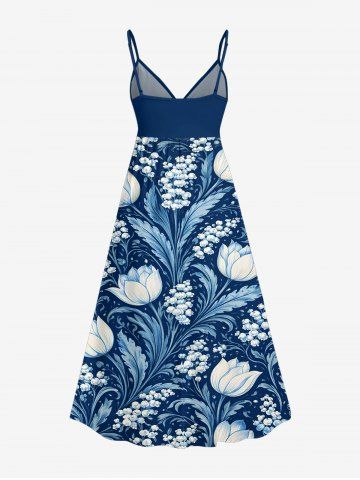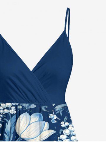 Plus Size Flower Leaf Branch Print Hawaii Surplice A Line Cami Dress - Bleu - Bleu