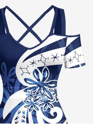 Plus Size Flower Leaf Print Cold Shoulder Crisscross Hawaii Maxi Dress - Bleu Profond - 2x