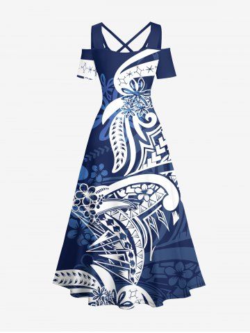 Plus Size Flower Leaf Print Cold Shoulder Crisscross Hawaii Maxi Dress - Bleu Profond - 3x
