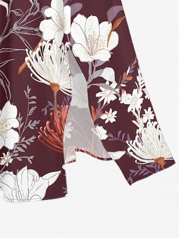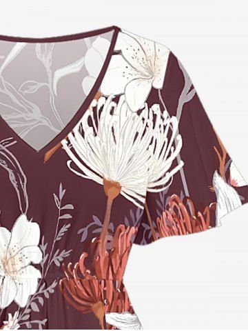 Plus Size Flower Plant Print Hawaii Split Pocket A Line Midi Dress - Rouge Foncé - 4x