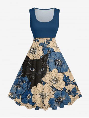 Plus Size Flowers Cat Print Hawaii 1950s Vintage Dress - Bleu - Bleu