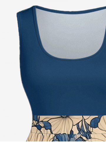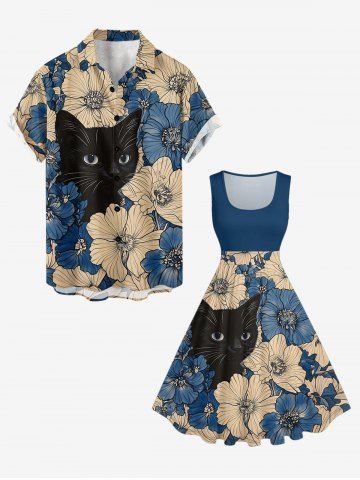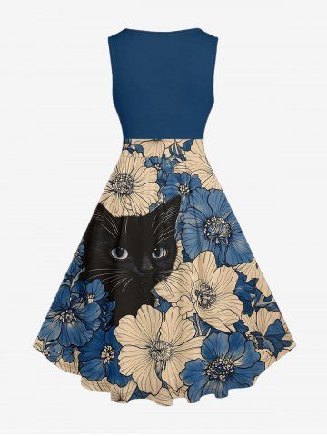Plus Size Flowers Cat Print Hawaii 1950s Vintage Dress - Bleu - Bleu