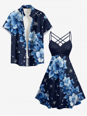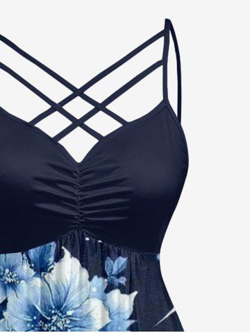 Plus Size Flowers Galaxy Glitter 3D Print Ruched Lattice Crisscross Straps Hawaii Dress - Bleu Profond - S