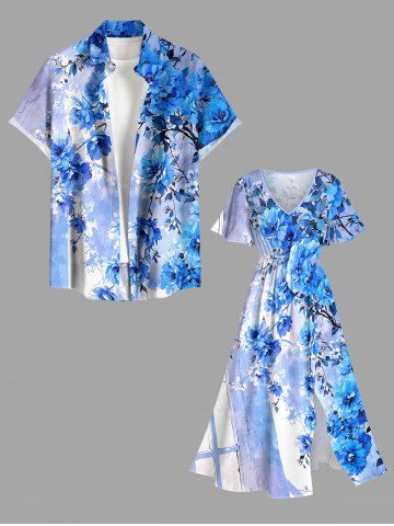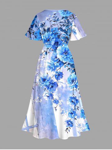 Plus Size Flowers Leaf Paint Splatter Print Split Hawaii Midi Dress - Bleu - Bleu