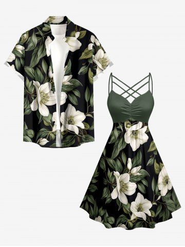 Plus Size Flowers Leaf Print Ruched Lattice Crisscross Straps Hawaii Dress - Plant Green - 3x