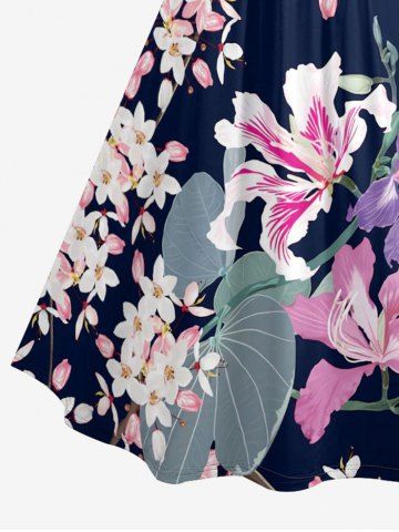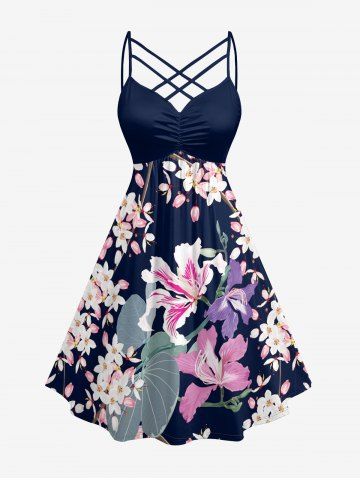 Plus Size Flowers Leaf Print Ruched Lattice Crisscross Straps Hawaii Dress - Bleu Profond - 6x