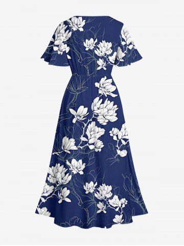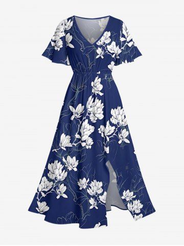 Plus Size Flowers Leaf Print Split Hawaii Midi Dress - Bleu Profond - L