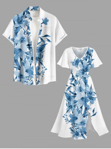 Plus Size Flowers Leaf Print Split Hawaii Midi Dress - Bleu Poudre - 2x