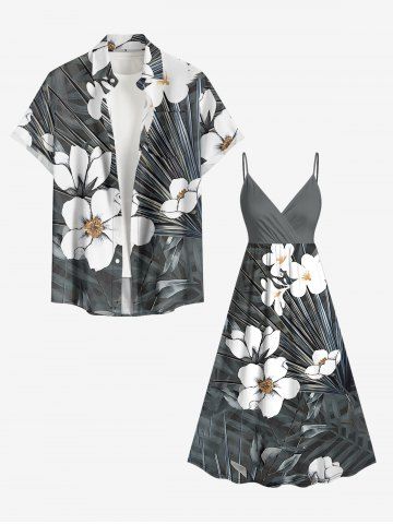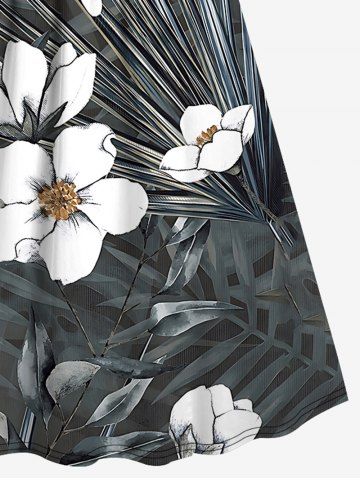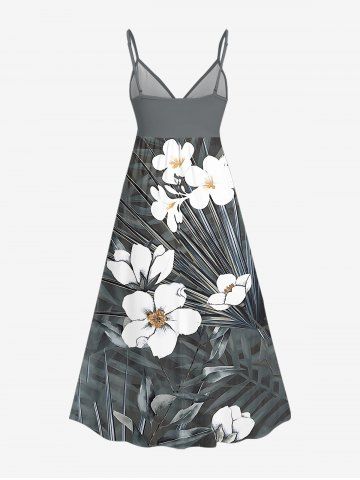 Plus Size Flowers Leaf Print Surplice Hawaii Cami Dress - Gris Foncé - Gris Foncé