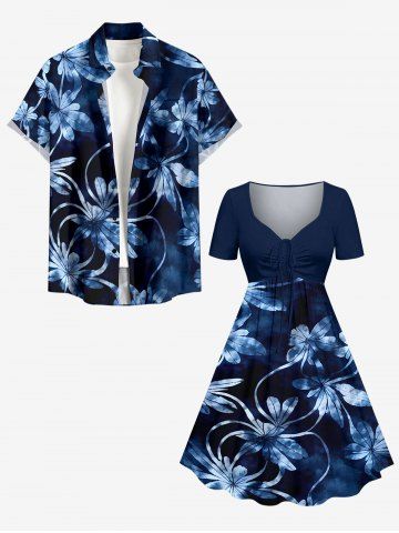 Plus Size Flowers Leaf Tie Dye Print Cinched Hawaii Dress - Cadetblue - S