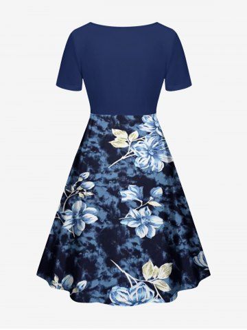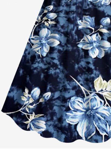 Plus Size Flowers Leaf Tie Dye Print Cinched Hawaii Dress - Bleu Profond - 1x