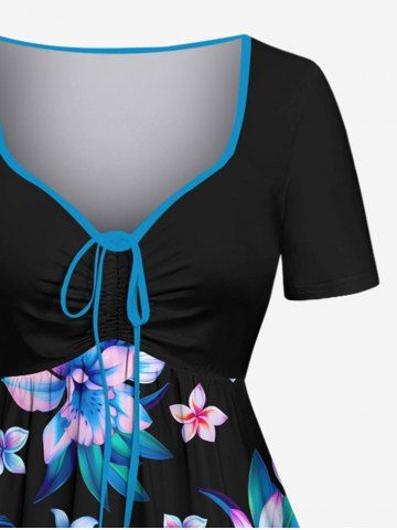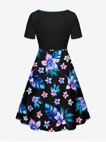 Plus Size Flowers Leaf Tropical Print Cinched Hawaii Dress - Noir - Noir