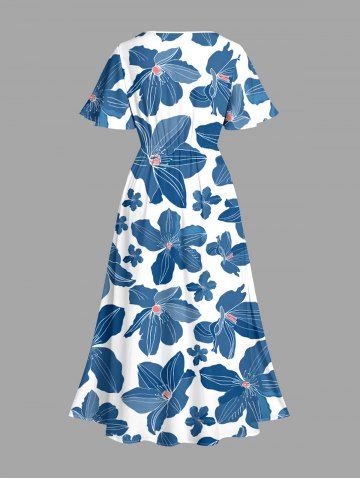 Plus Size Flowers Print Split Hawaii Midi Dress - Bleu - Bleu