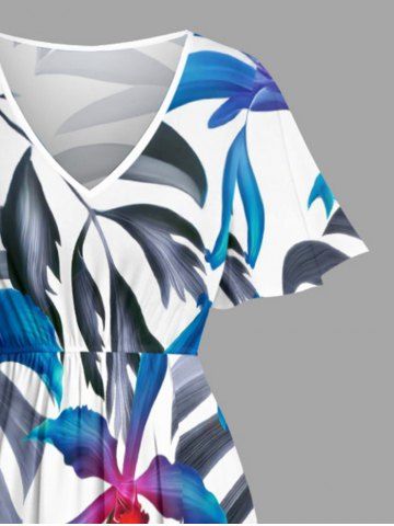 Plus Size Flowers Tropical Leaf Print Split Hawaii Midi Dress - Bleu - Bleu