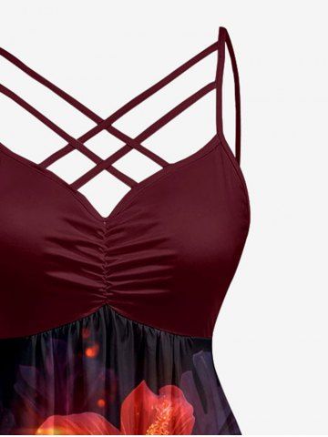 Plus Size Glitter Hibiscus Flower Print Hawaii Ruched Crisscross A Line Dress - Rouge Foncé - 3x