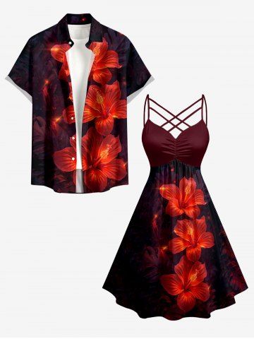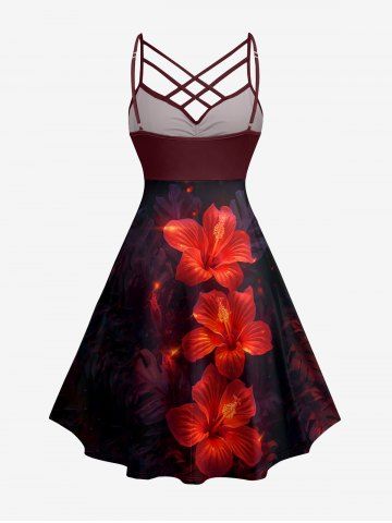 Plus Size Glitter Hibiscus Flower Print Hawaii Ruched Crisscross A Line Dress - Rouge Foncé - 5x