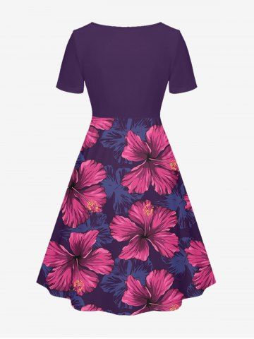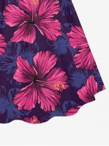Plus Size Hibiscus Flower Leaf Print Cinched Hawaii Dress - Violacé Rouge - 3x