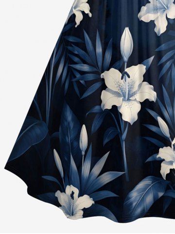 Plus Size Hibiscus Flower Leaf Print Ruched Lattice Crisscross Straps Hawaii Dress - Bleu Profond - 1x
