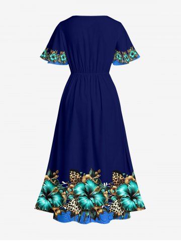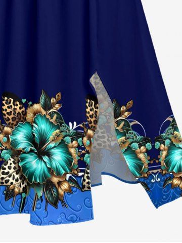 Plus Size Hibiscus Flower Leopard Leaf Print Hawaii Split Pocket A Line Midi Dress - Cadetblue - 3x