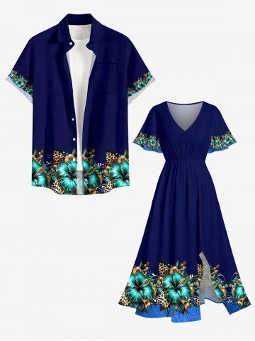 Robes Graphiques > Plus Size Hibiscus Flower Leopard Leaf Print Hawaii Split Pocket A Line Midi Dress
