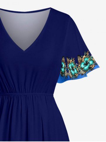 Plus Size Hibiscus Flower Leopard Leaf Print Hawaii Split Pocket A Line Midi Dress - Cadetblue - 4x