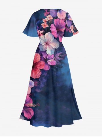 Plus Size Hibiscus Flower Print Split Hawaii Midi Dress - Bleu Profond - 3x